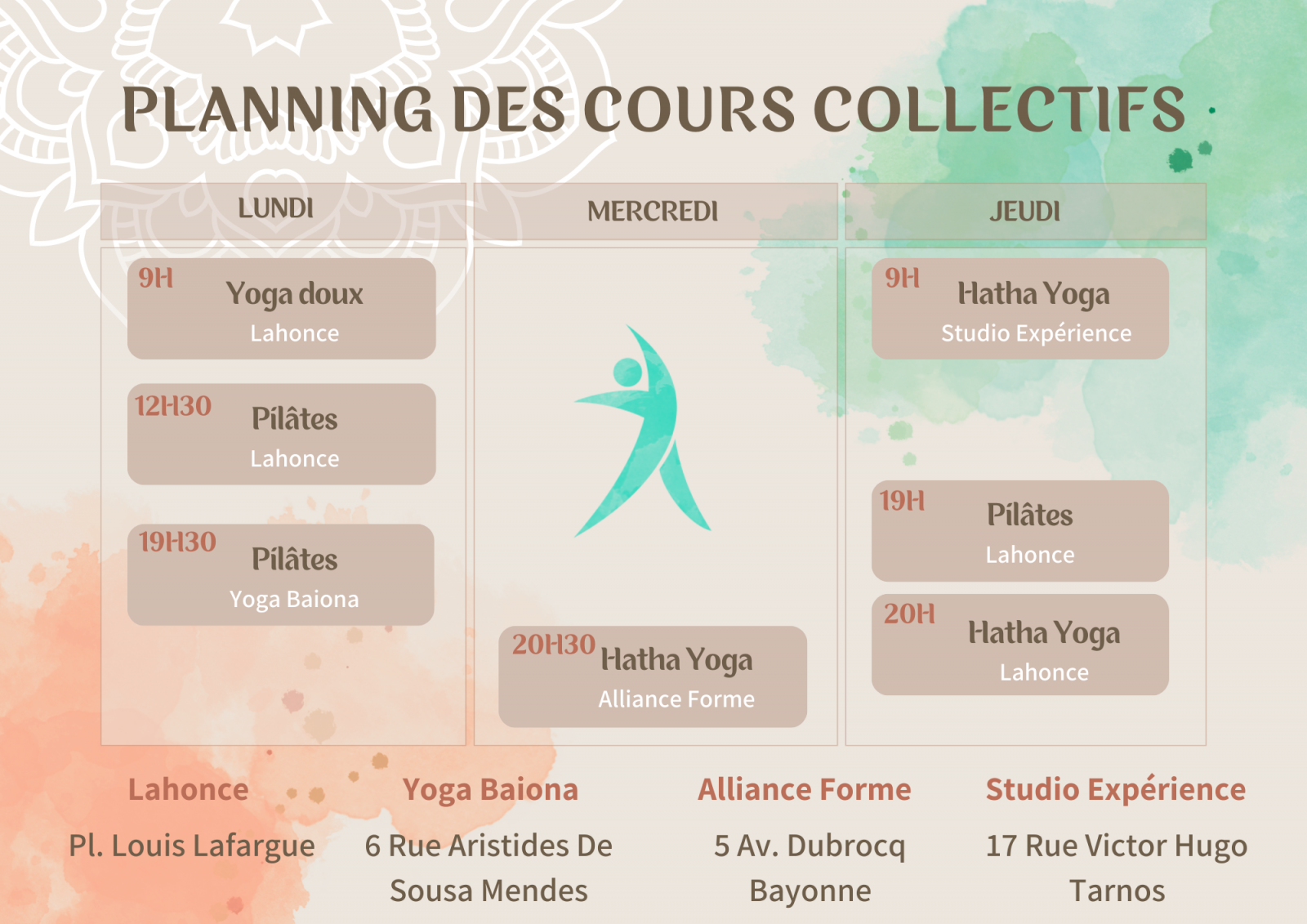 Voici les tarifs des cours et ateliers, en présentiel et en ligne, à Bayonne, Tarnos, et Anglet.